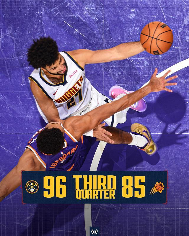 中场休息回来,掘金连续三节单节轰下30+得分,且限制太阳本场第二次单节不超过25分。约基奇继续保持百分百准星达成准三双数据,且携手穆雷与小哈达威均是达成20+得分,引领掘金单节33-25净胜8分,三节结束掘金扩大96-85领先太阳。前三节比赛,掘金三分命中数18-11净胜7记三分,约基奇6中6得到23+9+8引领掘金4人得分上双,穆雷22分与小哈达威23分,布克18分6助攻与狄龙19分,引领太阳也是4人得分上双。