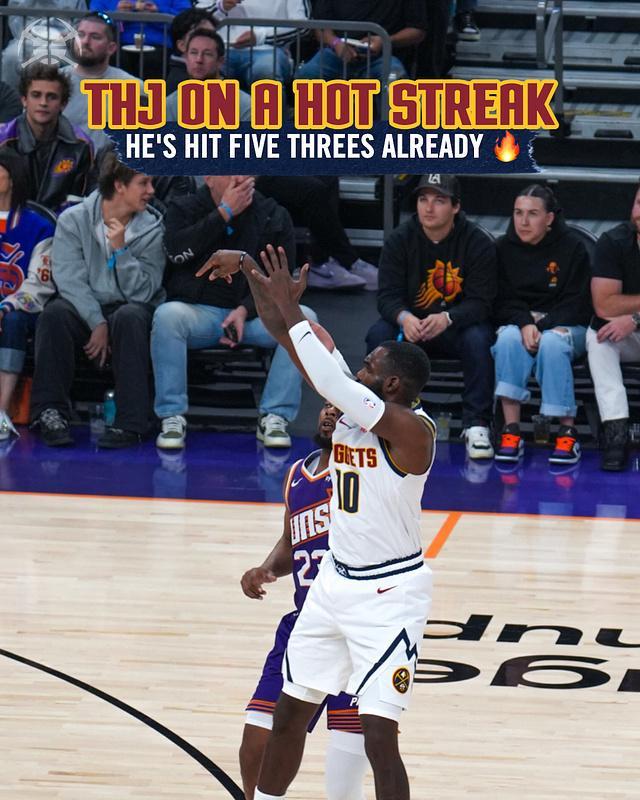 次节比赛,掘金连续两节单节轰下30+得分,太阳则完成两队本场首次单节35+得分。约基奇延续自己的百分百准星,他单节再得到5分1篮板1助攻,小哈达威爆发接连外线三分命中,引领掘金单节33-35被追回2分,上半场结束掘金63-60领先太阳3分。前两节比赛,掘金三分命中数10-9领先,约基奇5中5得到18+5+4、小哈达威5记三分17分与穆雷13分,狄龙19分与吉莱斯皮4记三分12分,布克9分4助攻。